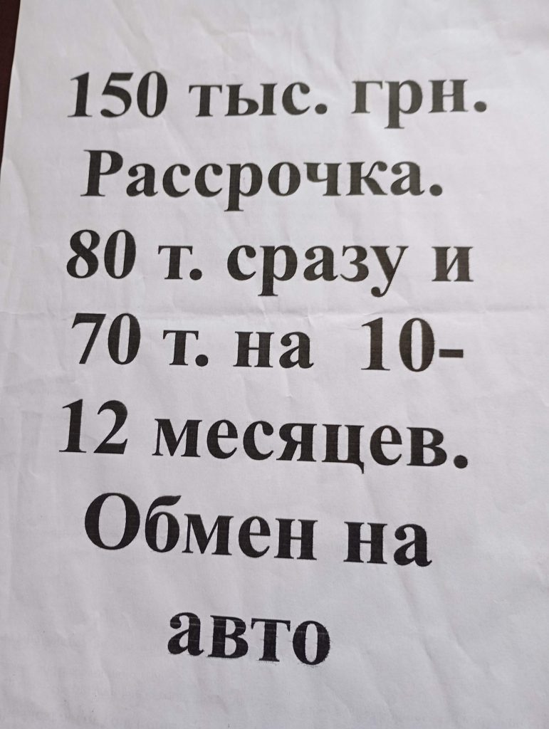 Полная стоимость 150 тыс грн. : 80 сразу и 70 на 10-12 месяцев с помесячной оплатой. Для рассрочки необходимы ксерокопия личного паспорта , кода и расписка .